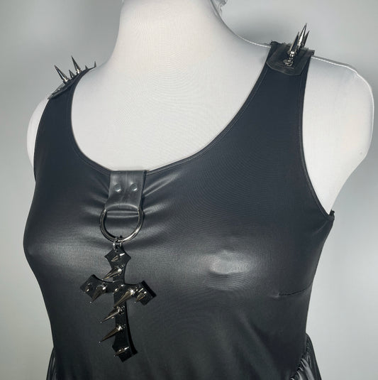 Black Stretchy Pleather Babydoll with Studded PVC Cross and Spiked Shoulders-SAMPLE