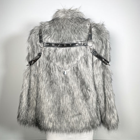 Grey with Silver Tinsel, Silver and Black Spiked Shoulder Harness Faux Fur Jacket