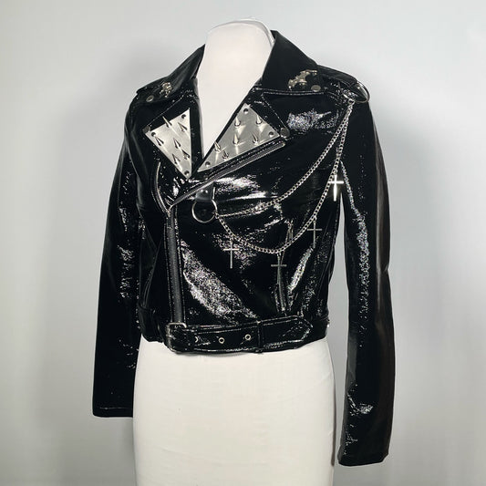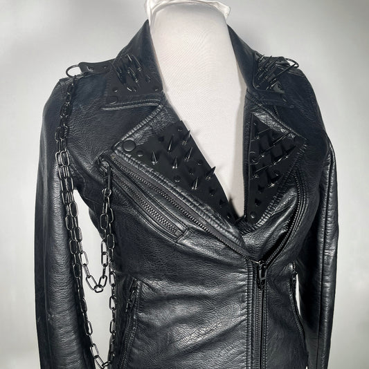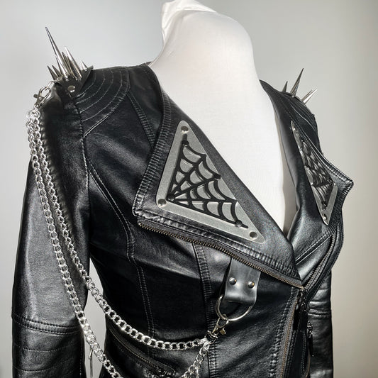Black Pleather Moto with Metal Plating, PVC Spiderwebs, Spiked Shoulders and Chains with Crosses