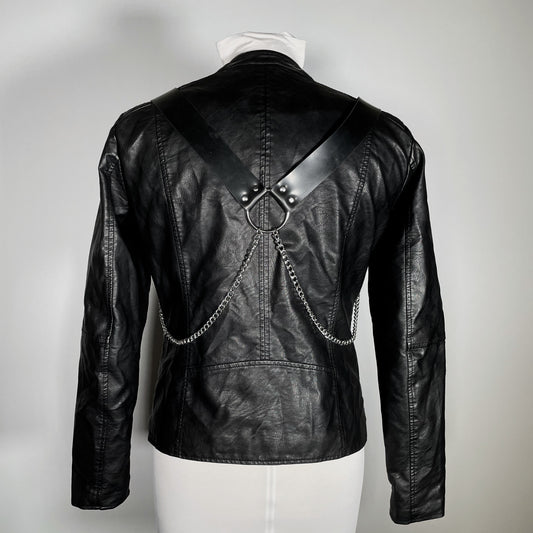 Black Pleather Moto Jacket with Metal Plating and Spikes and Harness back