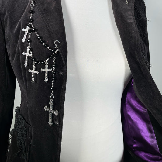 Black Velvet Blazer with Rosary Chain with Crosses and Cobwebs