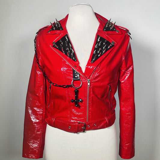 Red PVC Vinyl Goth Moto Jacket with Black PVC Cross, Collar and Black Chains
