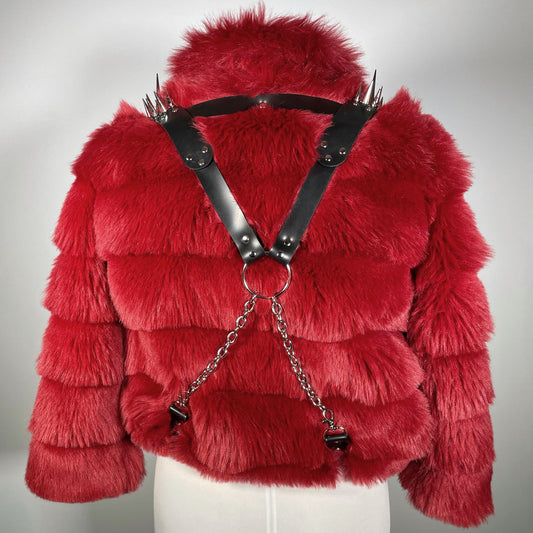 Red Faux Fur Cropped Jacket with Black Spiked Harness