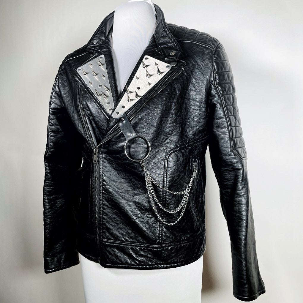I love that this is a harder edge version of a spiked collar moto jacket! The metal plates really give it a hard edge and unique look. It would be perfect for goth, industrial, cyberpunk, metal, punk or an overall unique style. This particular jacket was made from an revamped L pleather jacket, but I'm open to recreating this look on any size, so message me for custom orders!