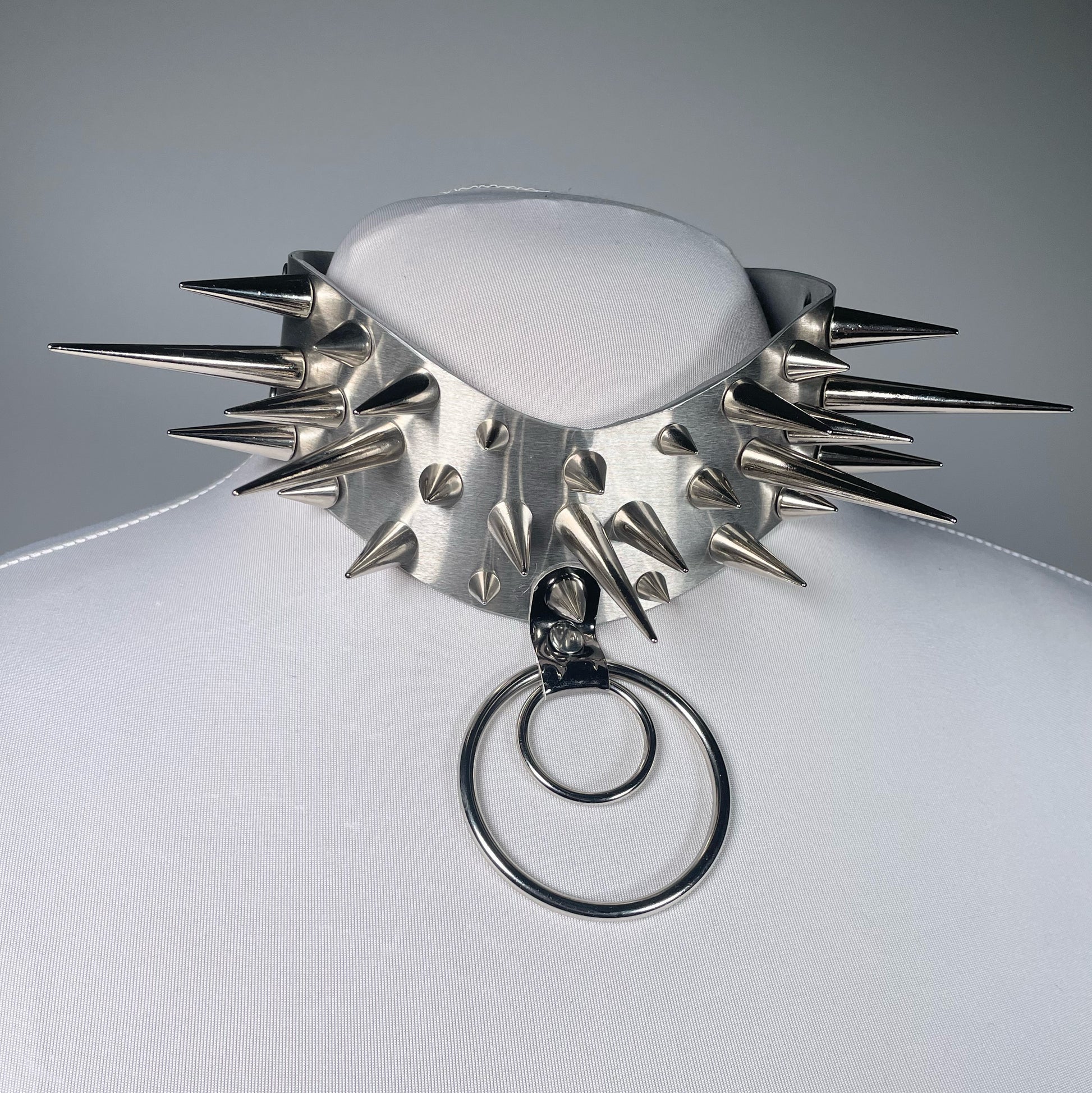 This metal neck collar is the perfect statement spiked collar for your collection! The metal spikes on metal base give this a different look than your traditional leather spiked collar, and the contoured cut and foam lining provide comfort and make this super flattering and easy to wear. Want an o-ring? Choose that option for a spiked bondage collar look.