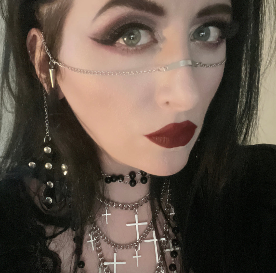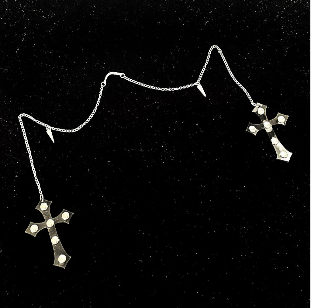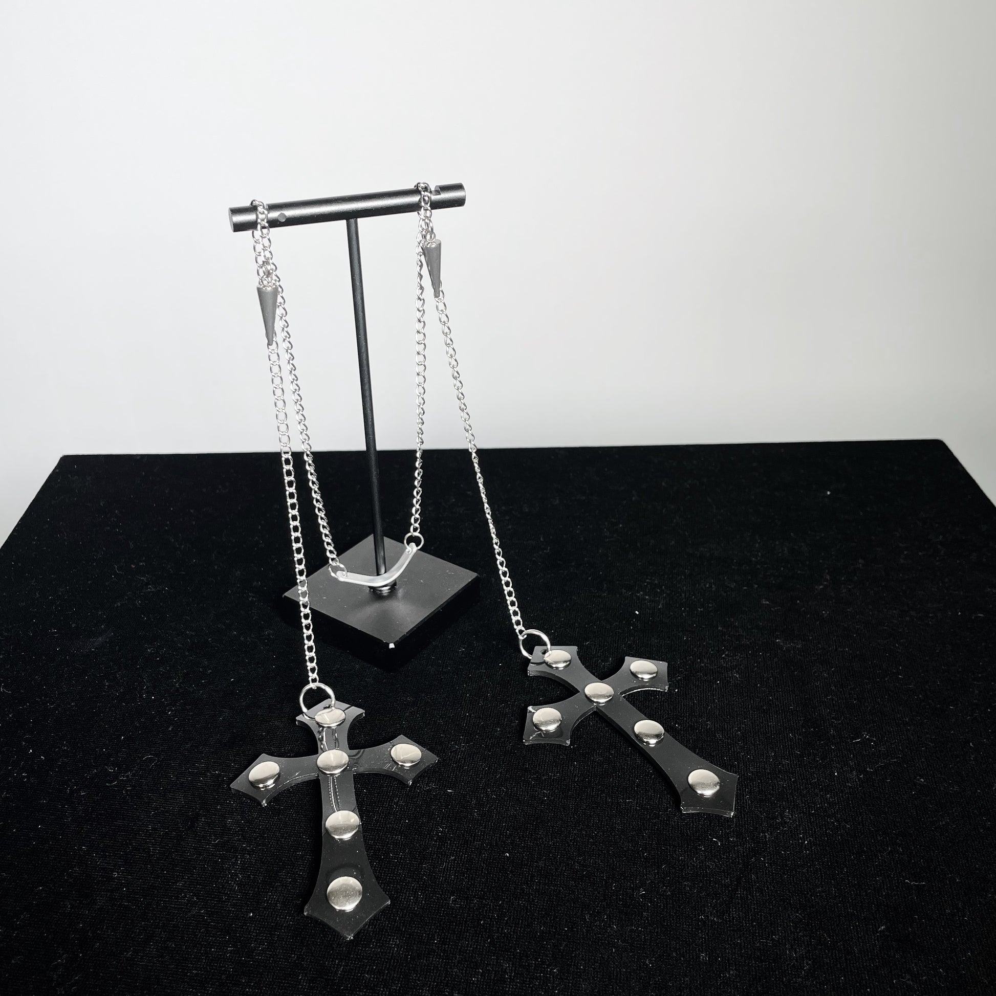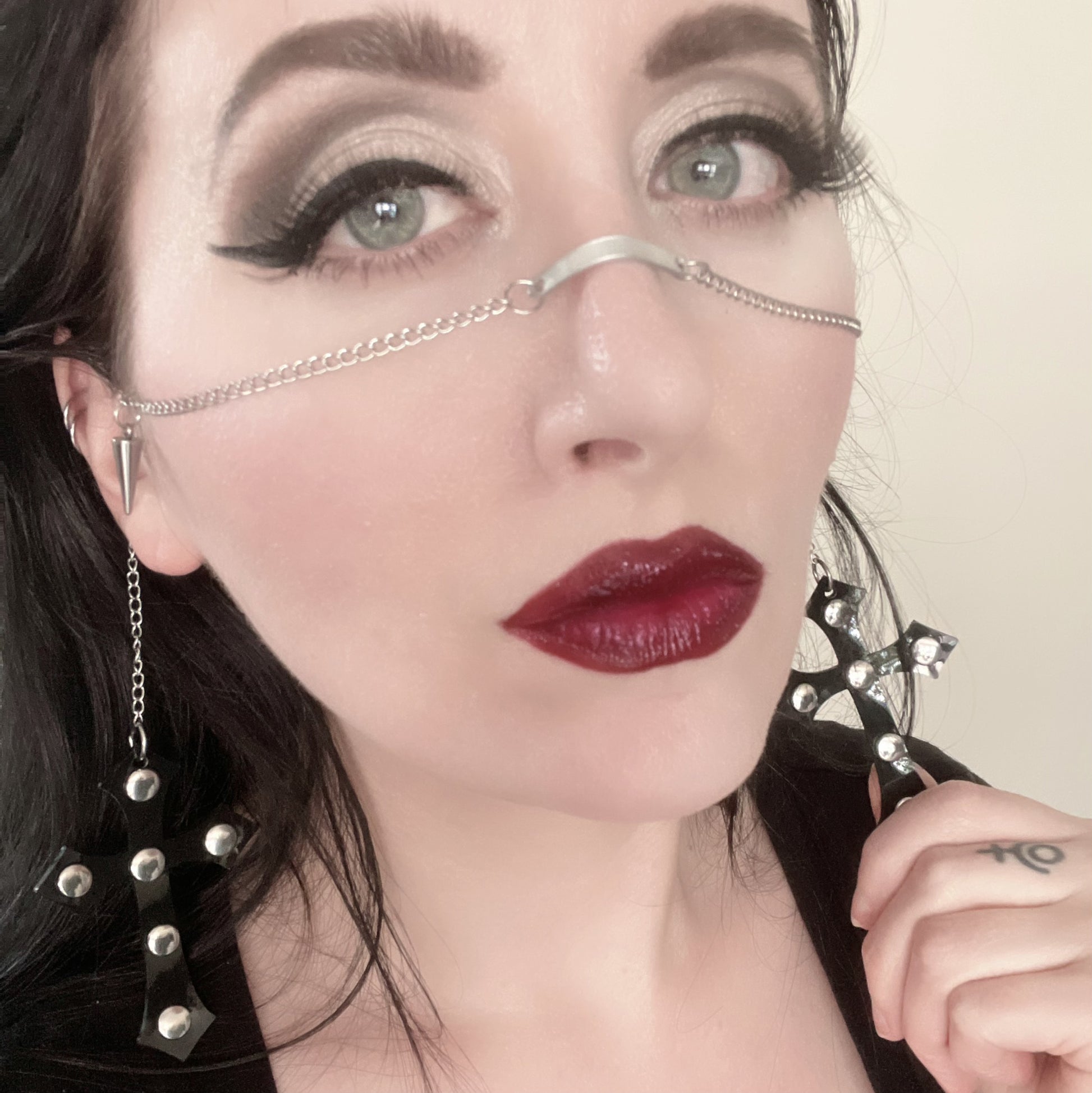 This studded PVC black cross face chain is great for all of your goth, punk and metal looks! NO piercings are necessary! Just pull the chain across your nose, tuck behind your ears, and you are ready to go.