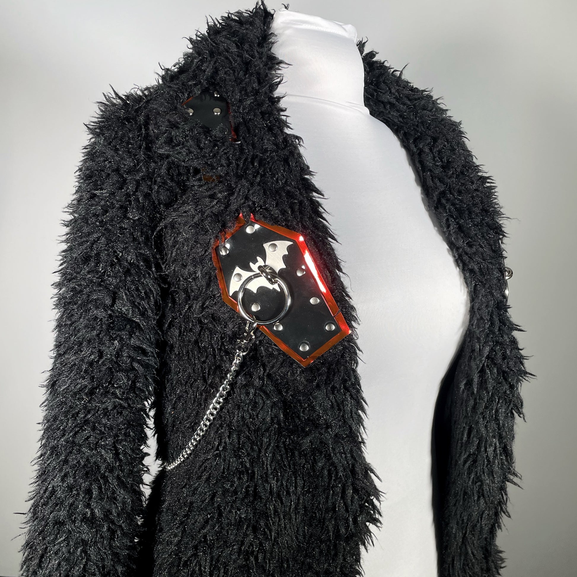 This revamped ultra soft faux fur coat is like wearing a blanket, it's so cuddly! The shiny vinyl/PVC o-ring bat coffin give this jacket a vampire vibe and the removable chain harness completes the look.