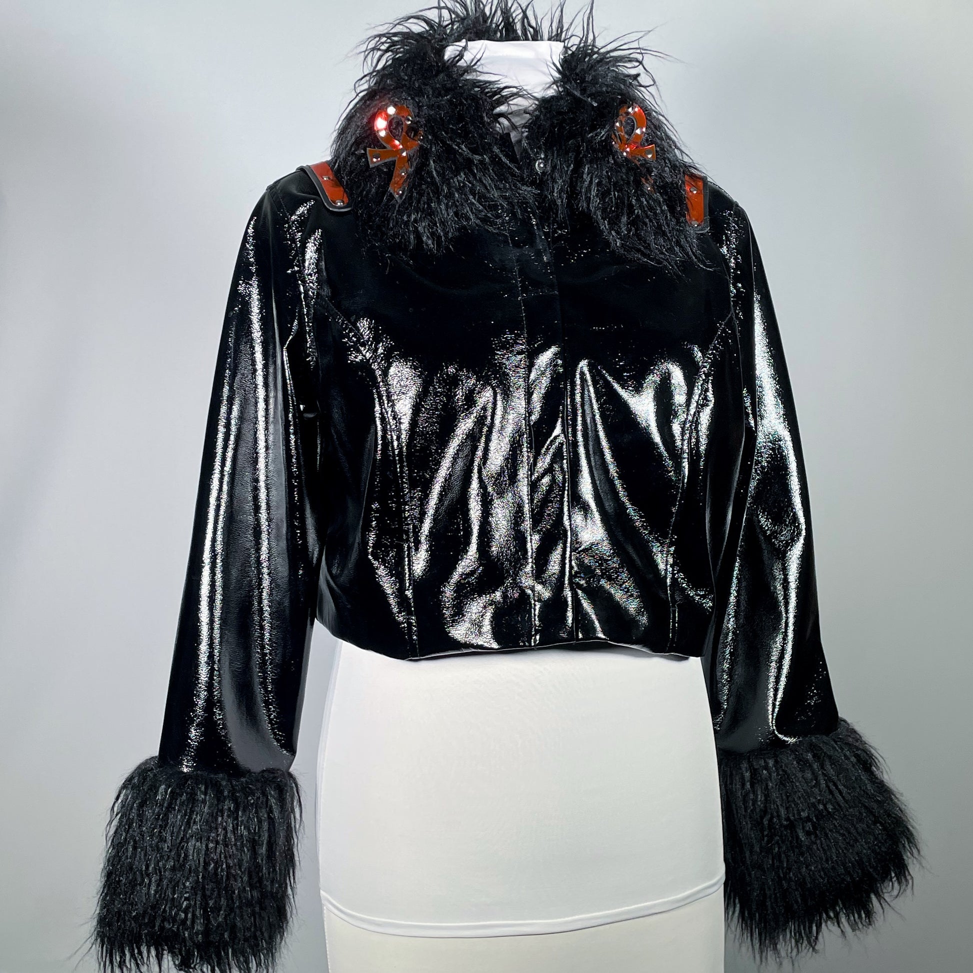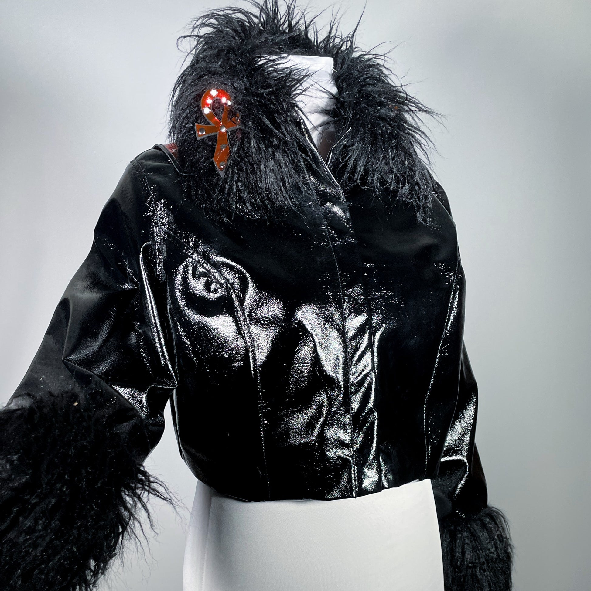 Black Vampire Ankh PVC Moto Jacket with Faux Fur