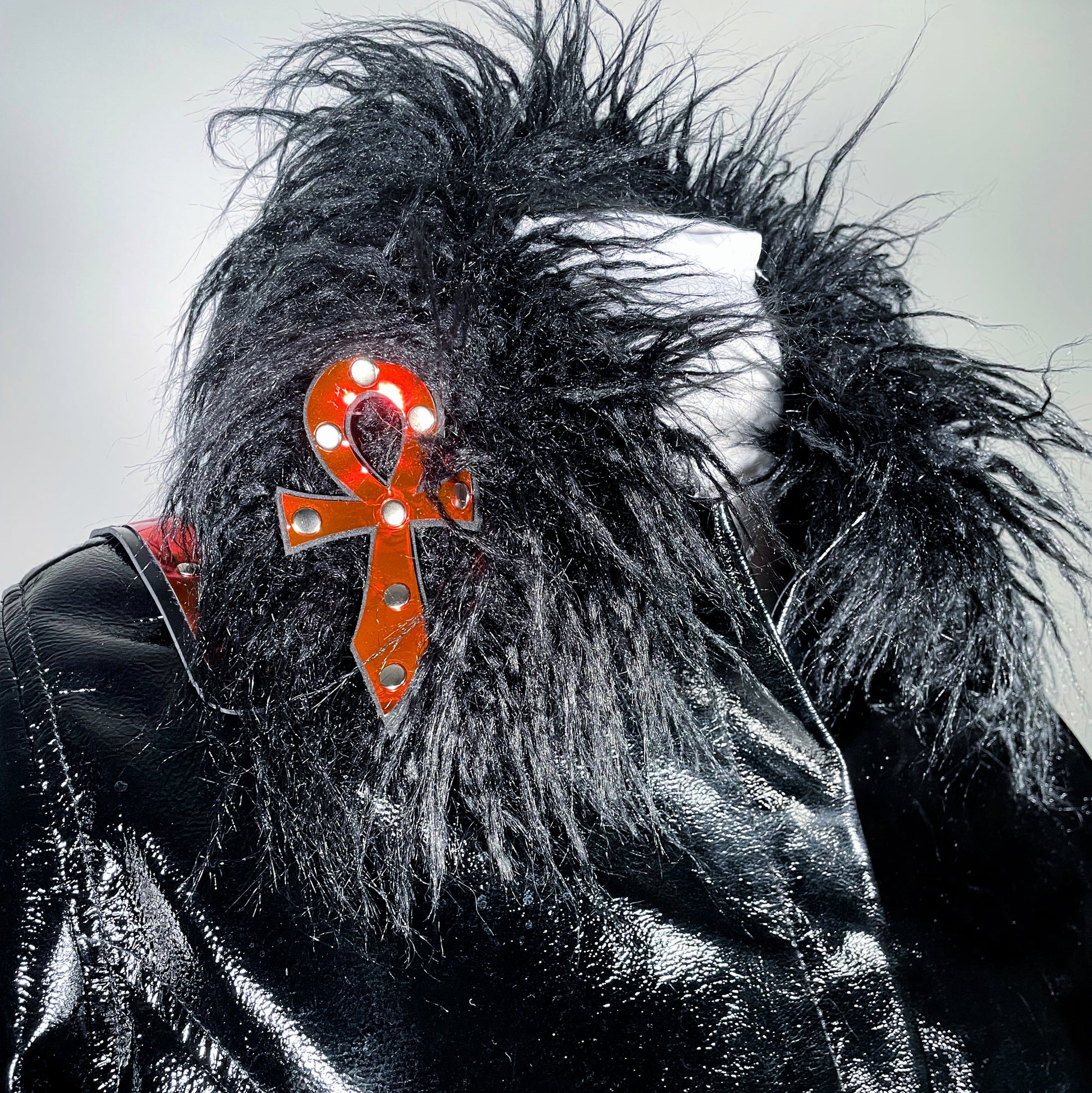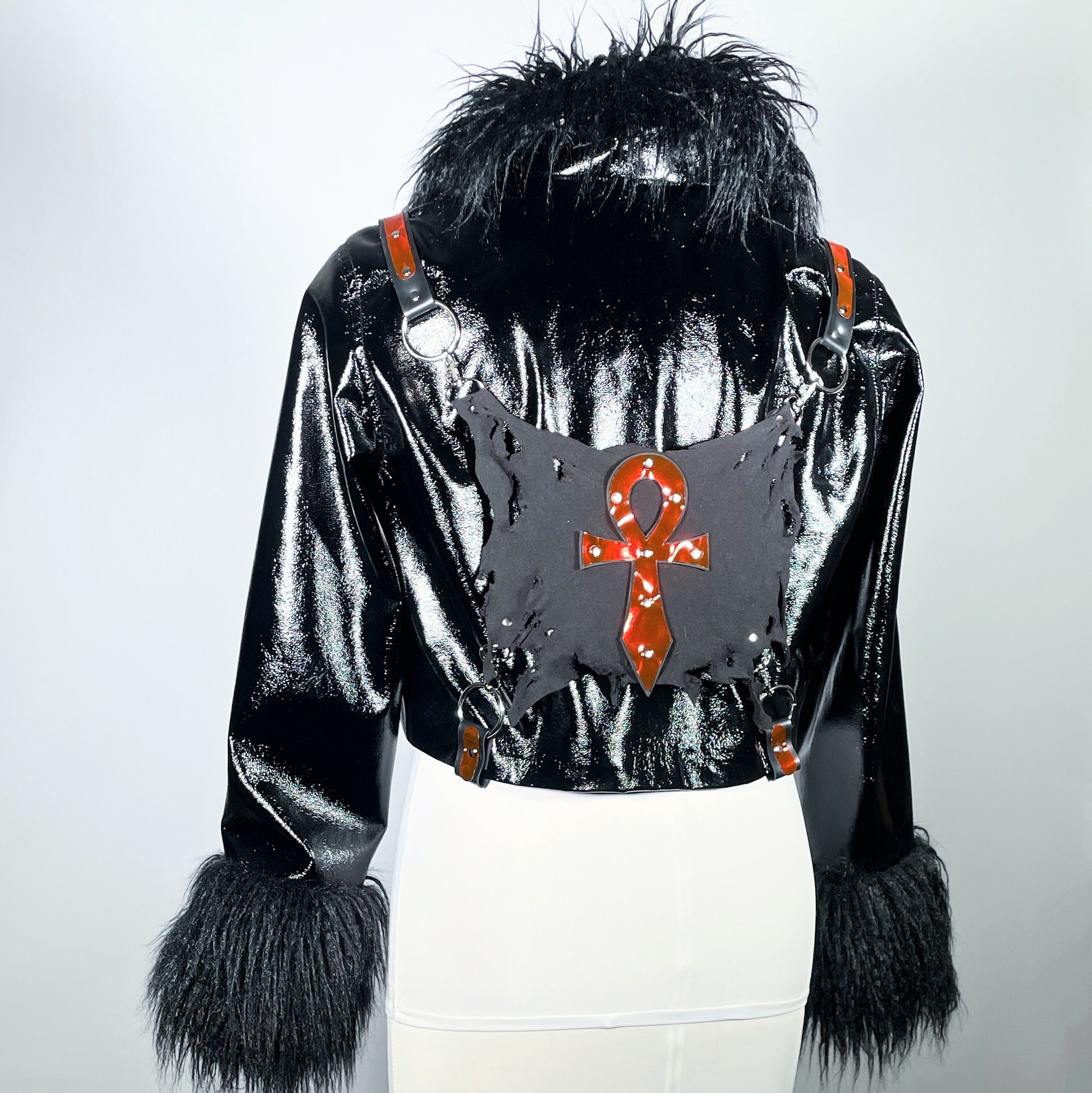 Black PVC moto with faux fur, with black and red studded vampire ankhs, with a removable ankh back patch harness back