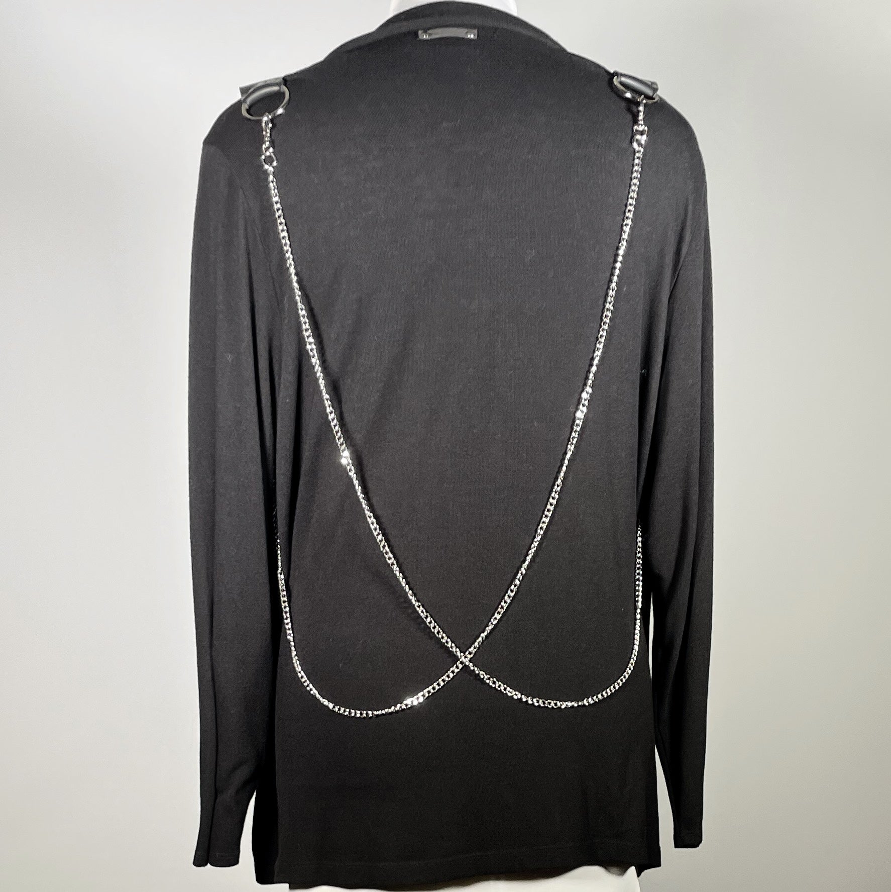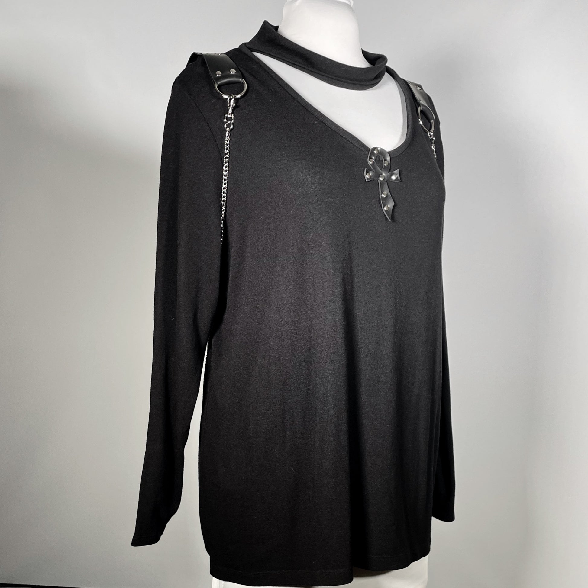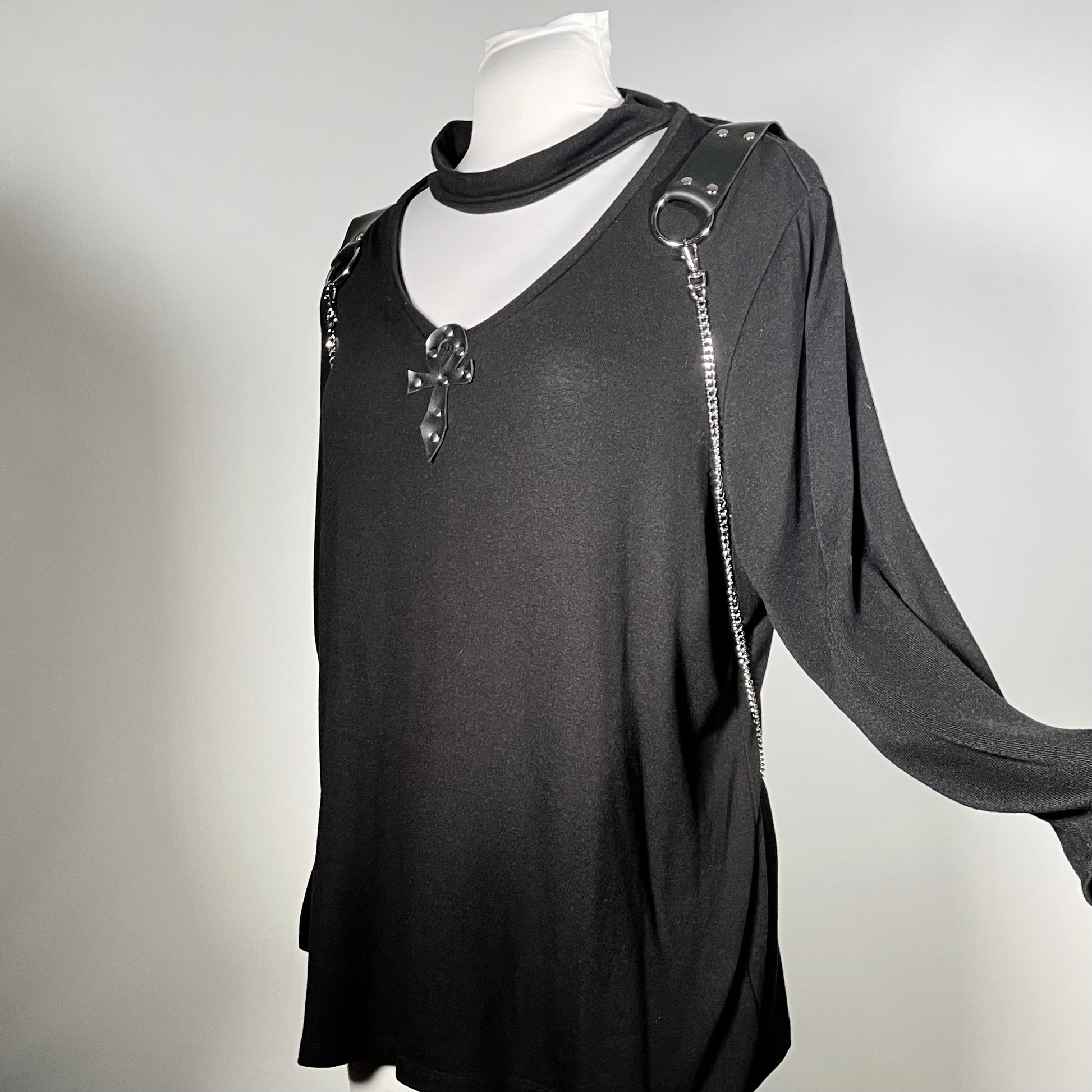 This revamped lightweight v-neck top just got cooler with the added harness shoulders and studded vampire ankh in front! The chain harness is removable and can be worn multiple ways! This top is soft and very stretchy. Gently hand wash and hang dry only.