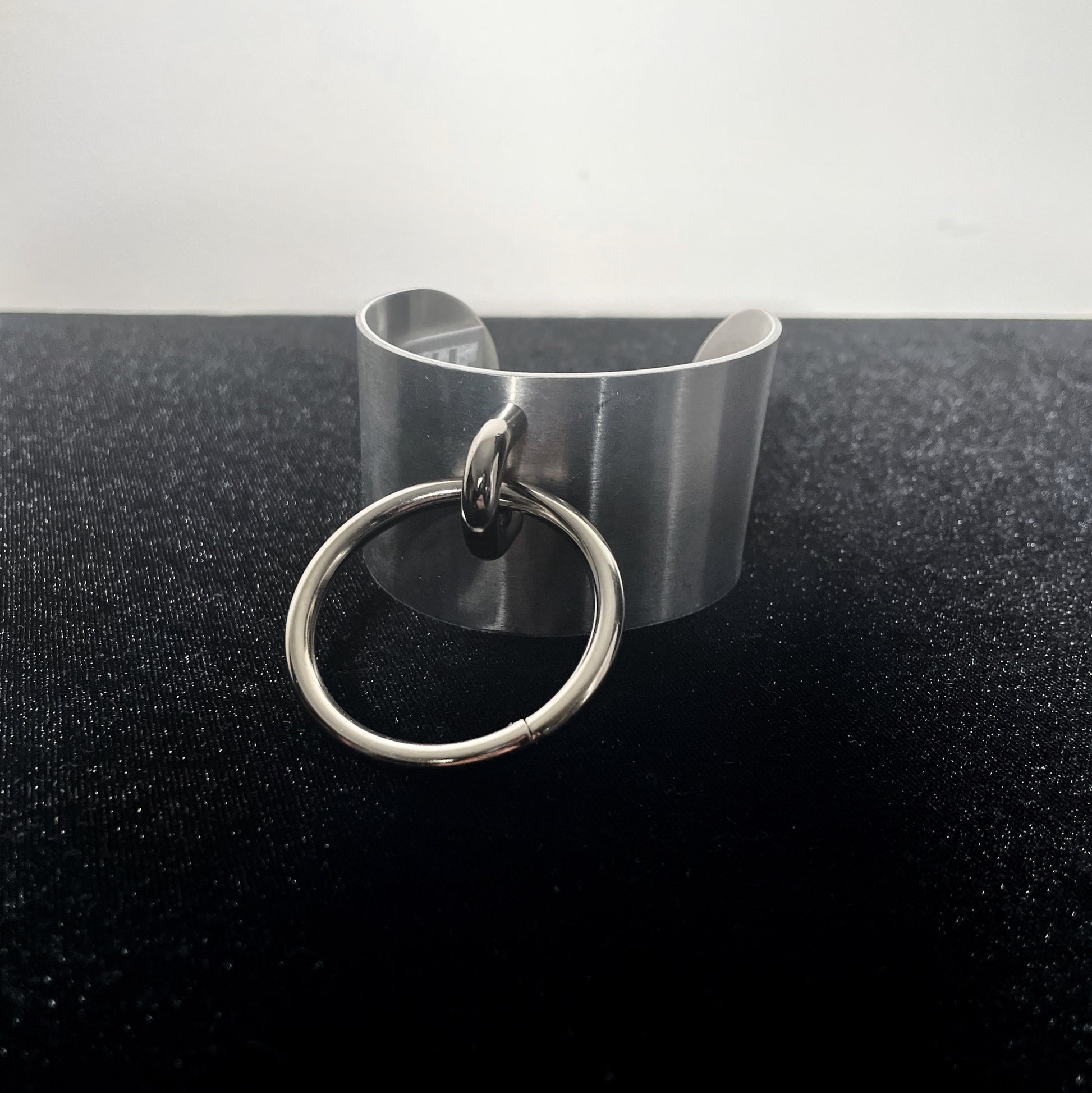All metal bondage cuff bracelet. Genderless and easy to put on. Just angle the cuff to slide your wrist in, then bend in place to keep closed.