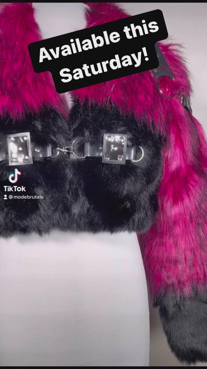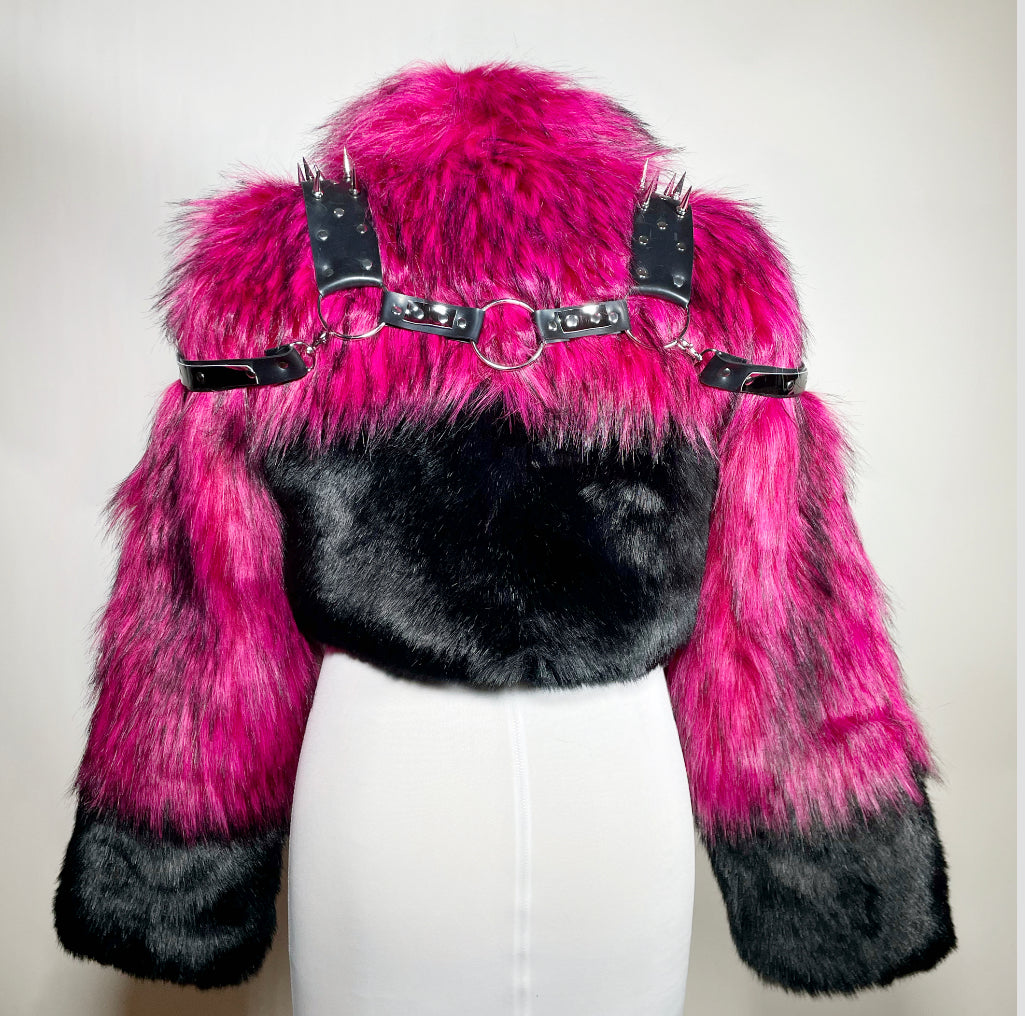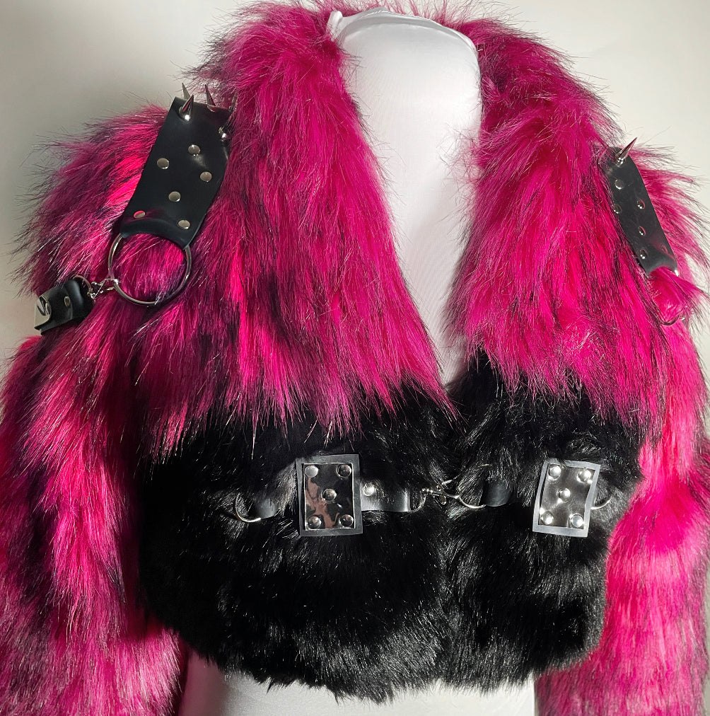 This revamped hot pink and black fur coat is cropped, fluffy and surprisingly heavier than what you would expect and warm! The harness straps with the metallic dark silver and matte black rubber totally channel 90’s/Y2K goth glam vibes!!! This is a very limited run, and once it’s gone it’s gone forever.