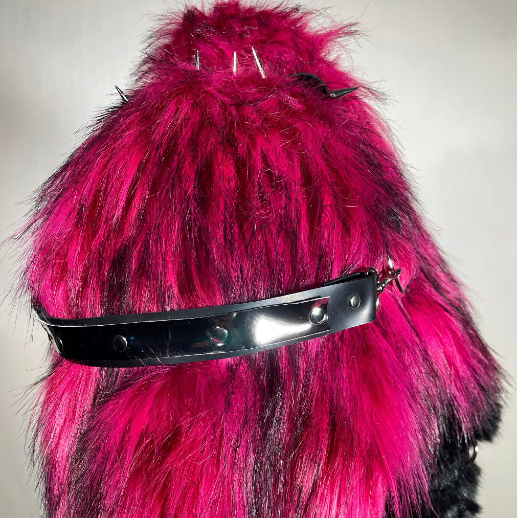 Hot pink and black faux fur cropped coat with black rubber and metallic silver vinyl harness