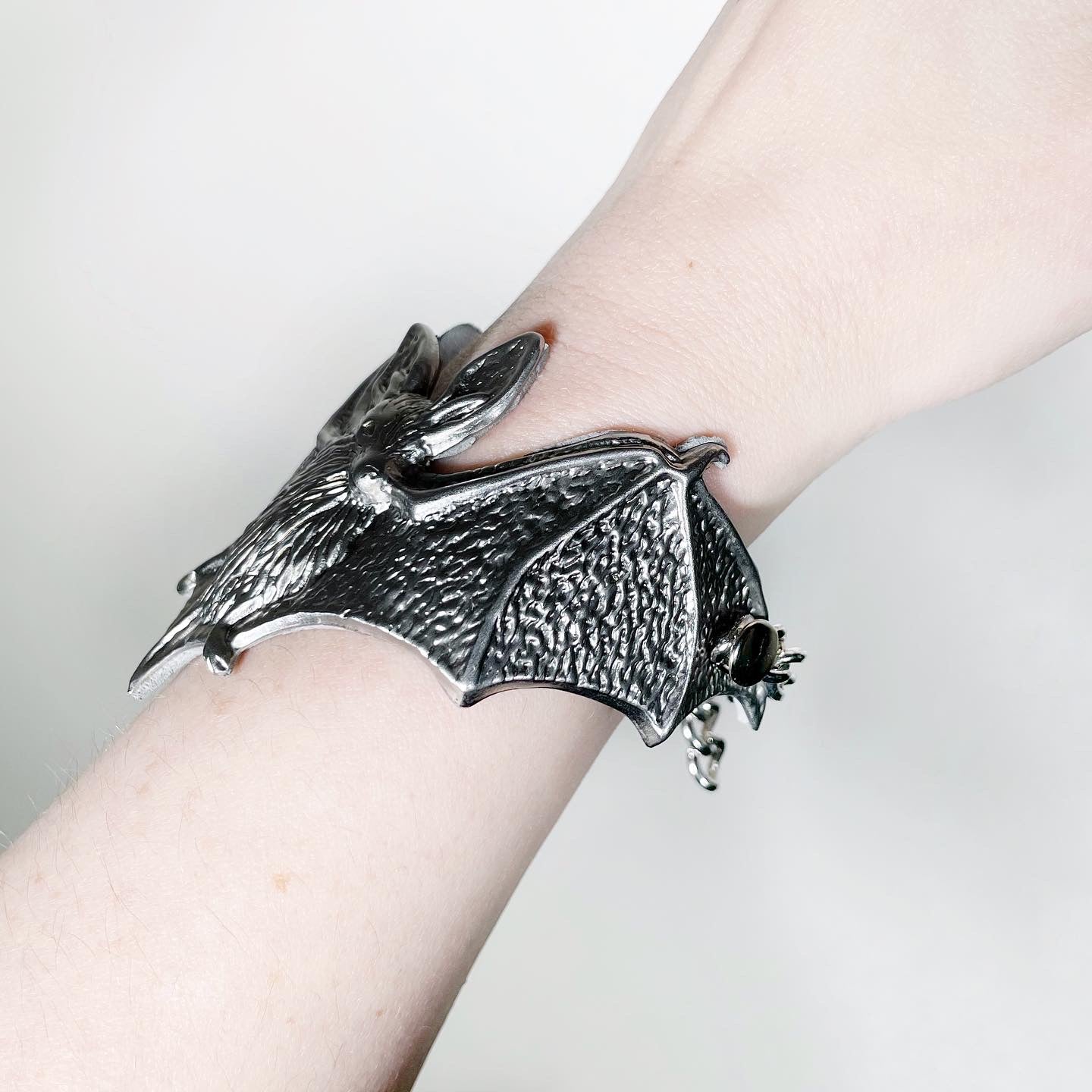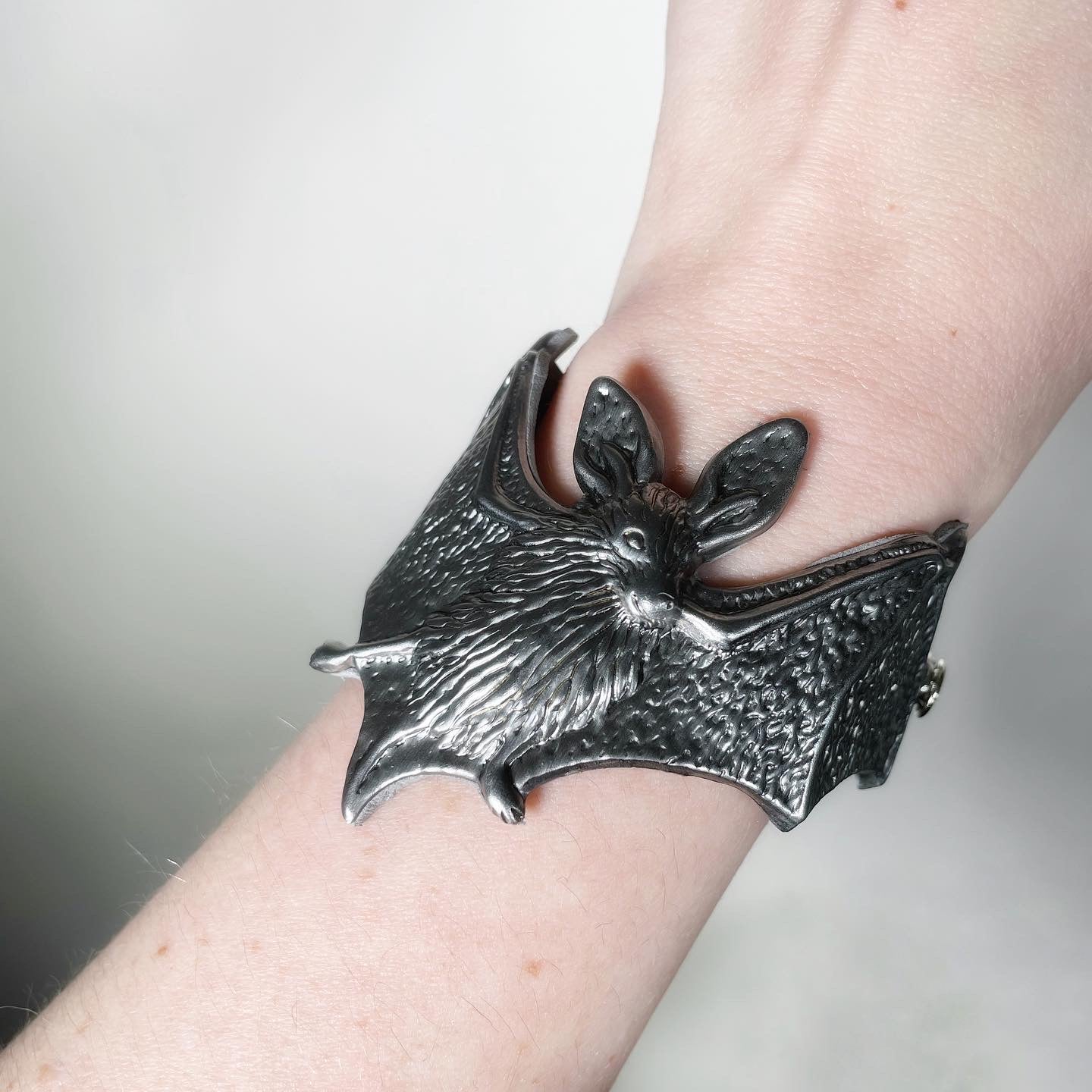 This steel bat bracelet makes the perfect little cuff! It's bendable so it's quite adjustable to your wrist, and it's lined with foam for comfort (because bat wings are pointy!) If you are extremely sensitive, let me know if you'd like it backed with a black rubber cuff, I'm happy to accommodate!