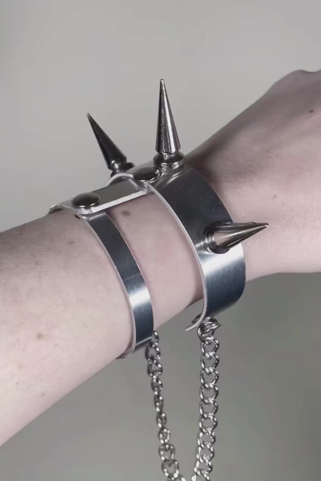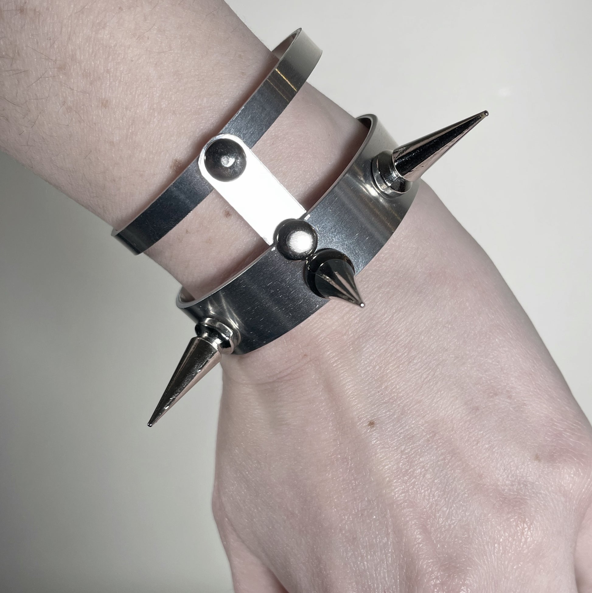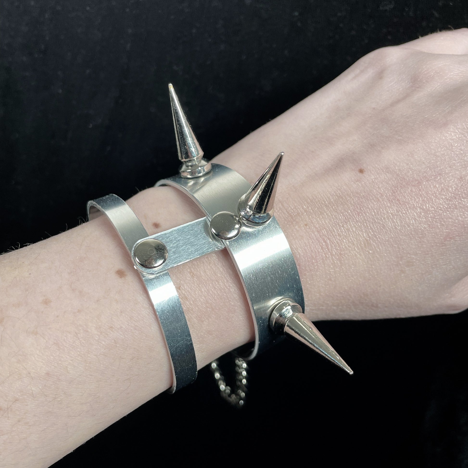 A slightly different take on a traditional spiked bracelet. This one has clean lines, and is minimal and modern in design, with just a few spikes and chain accents. Genderless and easy to put on. Just angle the cuff to slide your wrist in, then bend in place to keep closed.